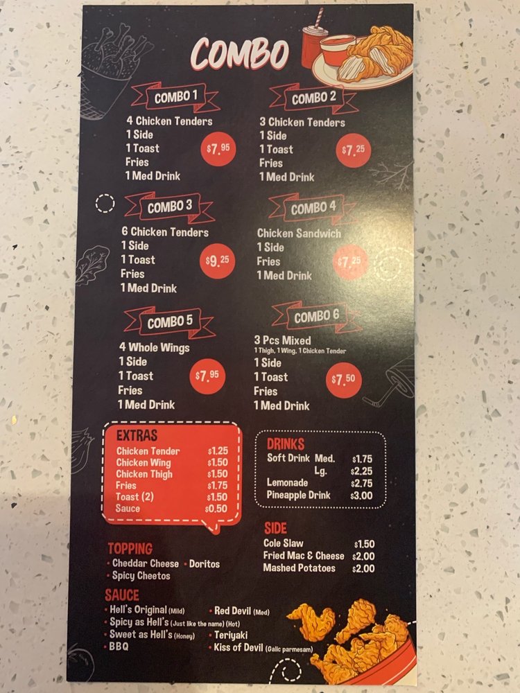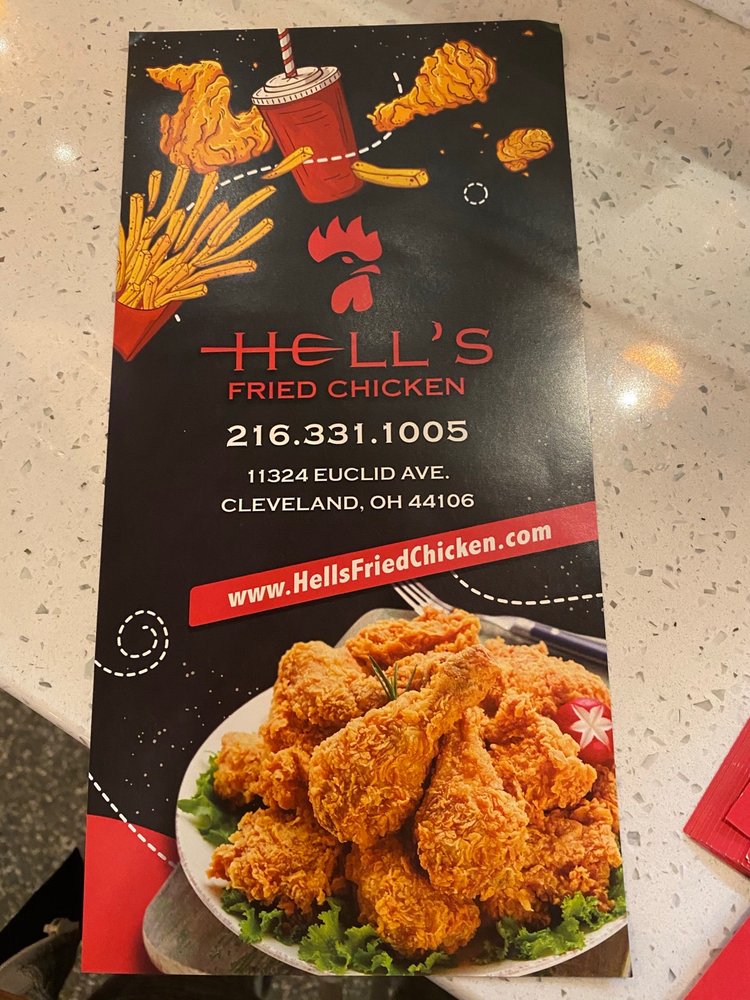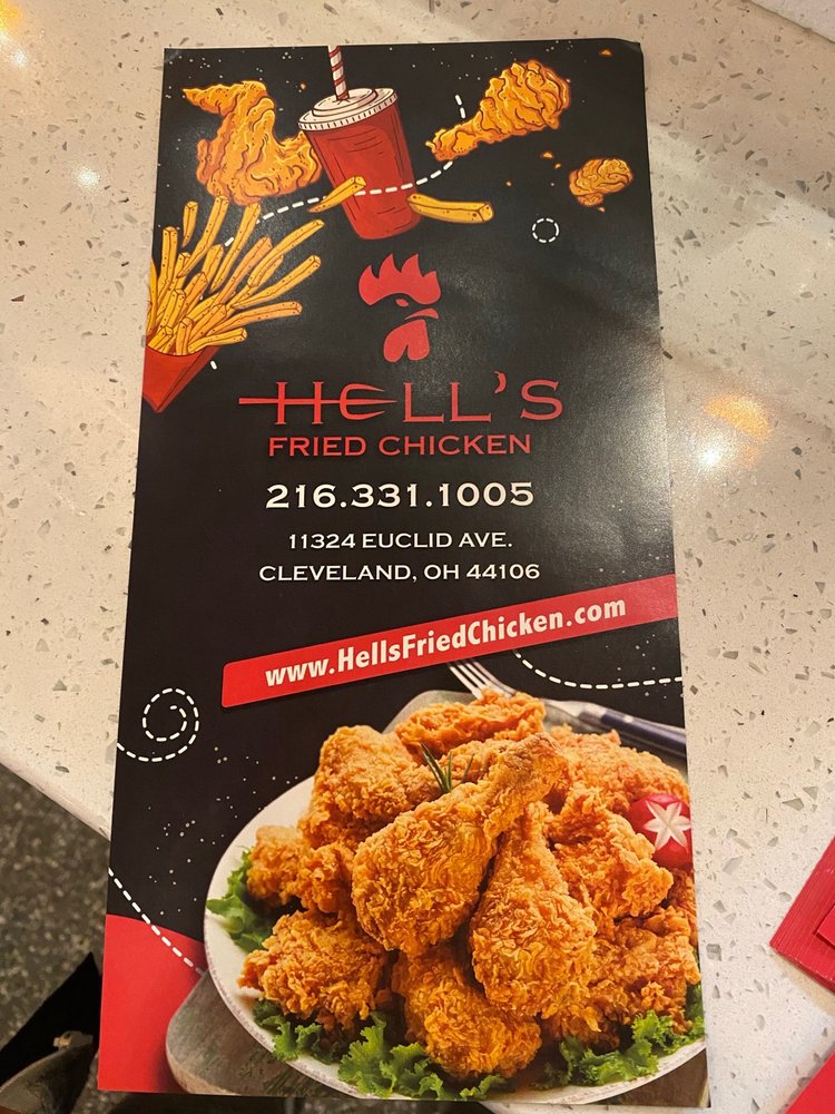 Hell's Fried Chicken, located on 11324 Euclid Ave in Cleveland, OH, offers a variety of delicious fried chicken options. The menu features combos like Combo 1 with chicken tenders, cole slaw, waffle, fries, and a drink for $11.95, and Combo 3 with six tenders, coleslaw, waffle, fries, sauces, and a drink for $13.80. Customers rave about the crispy and flavorful chicken tenders and the unique spice profile used in the breading. The coleslaw is described as creamy and flavorful, making it a standout side dish. While the menu lacks online updates, the service is fast and efficient. The fried macaroni and cheese side dish is a must-try, and the ample outdoor seating allows for safe dining. Don't miss out on this budget-friendly and tasty fried chicken spot in Cleveland.